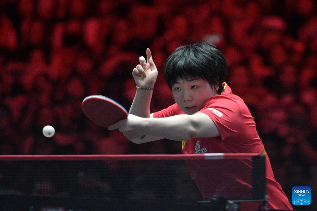 Kuai Man hits a return during the women's singles final between Sun Yingsha of China and Kuai Man of China at the World Table Tennis (WTT) Singapore Smash 2025 in Singapore, Feb. 9, 2025. (Photo by Then Chih Wey/Xinhua)