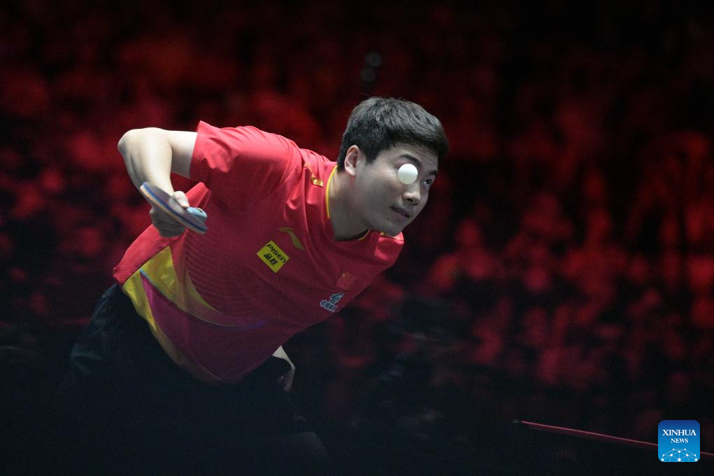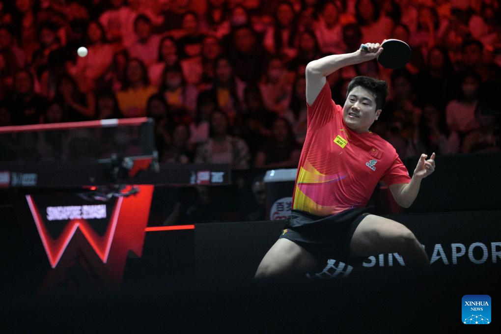 Liang Jingkun hits a return during the men's singles final between Lin Shidong of China and Liang Jingkun of China at the World Table Tennis (WTT) Singapore Smash 2025 in Singapore, Feb. 9, 2025. (Photo by Then Chih Wey/Xinhua)