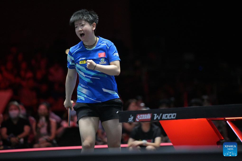 Kuai Man celebrates scoring during the women's singles final between Sun Yingsha of China and Kuai Man of China at the World Table Tennis (WTT) Singapore Smash 2025 in Singapore, Feb. 9, 2025. (Photo by Then Chih Wey/Xinhua)