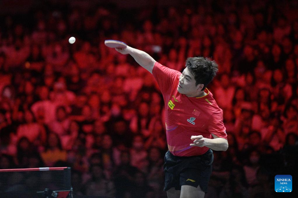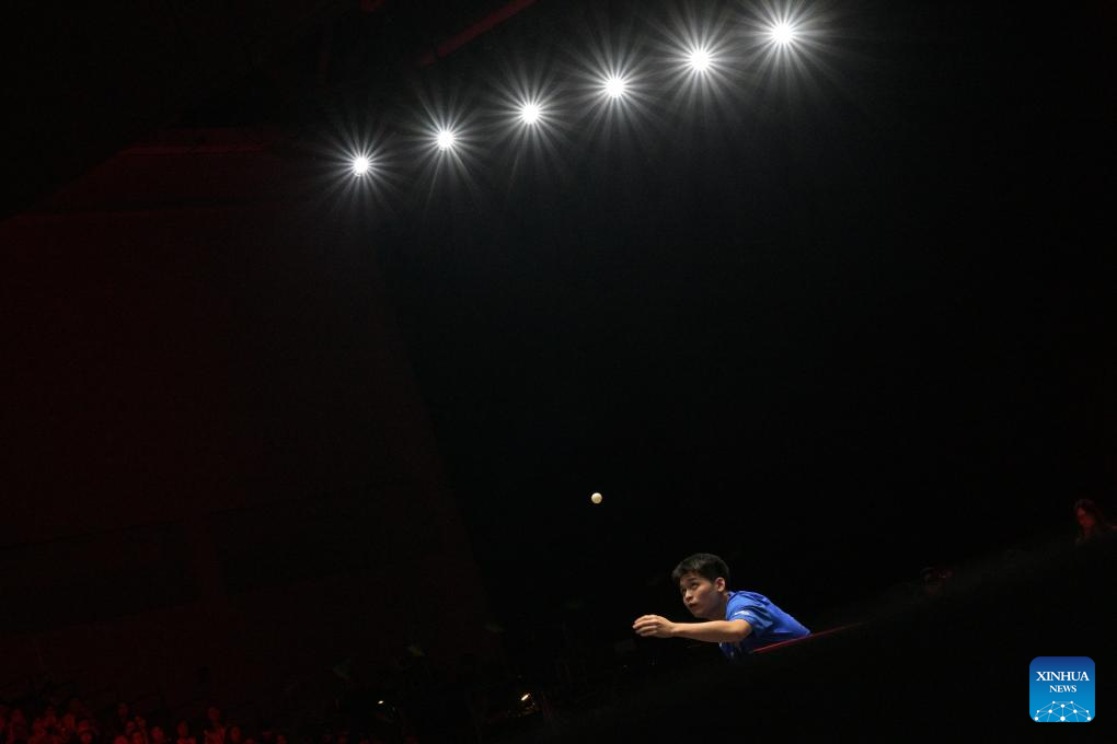 Lin Shidong hits a return during the men's singles final between Lin Shidong of China and Liang Jingkun of China at the World Table Tennis (WTT) Singapore Smash 2025 in Singapore, Feb. 9, 2025. (Photo by Then Chih Wey/Xinhua)