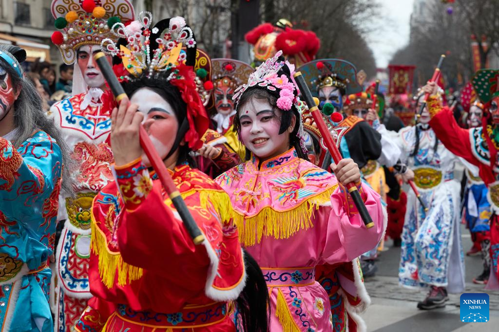 Yingge dance performers participate in a Chinese New Year parade in Paris, France, Feb. 9, 2025. (Xinhua/Meng Dingbo)