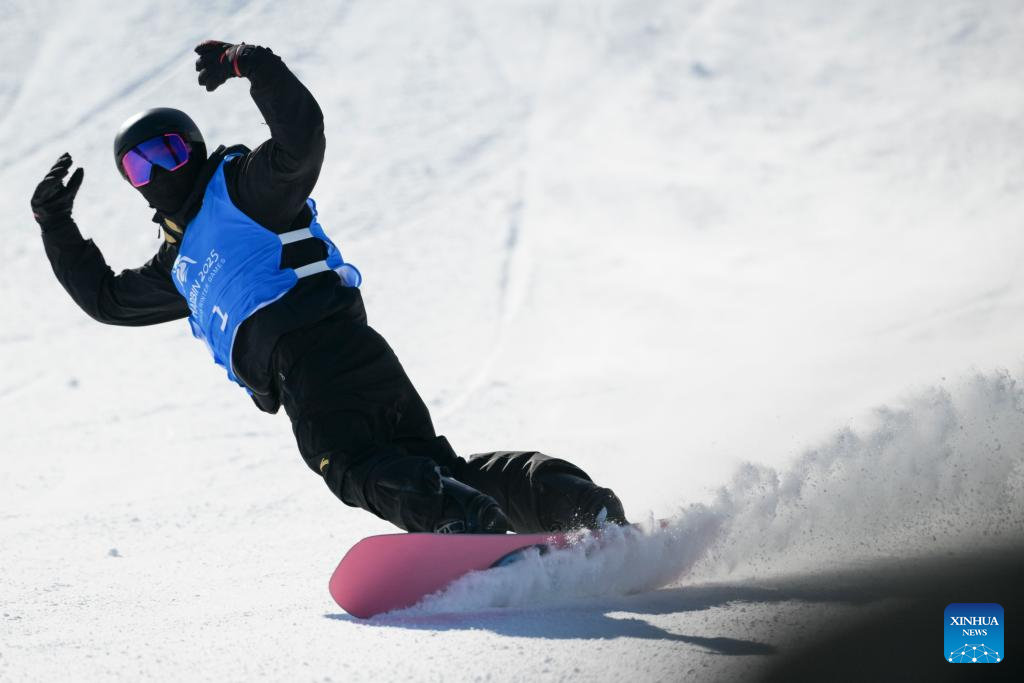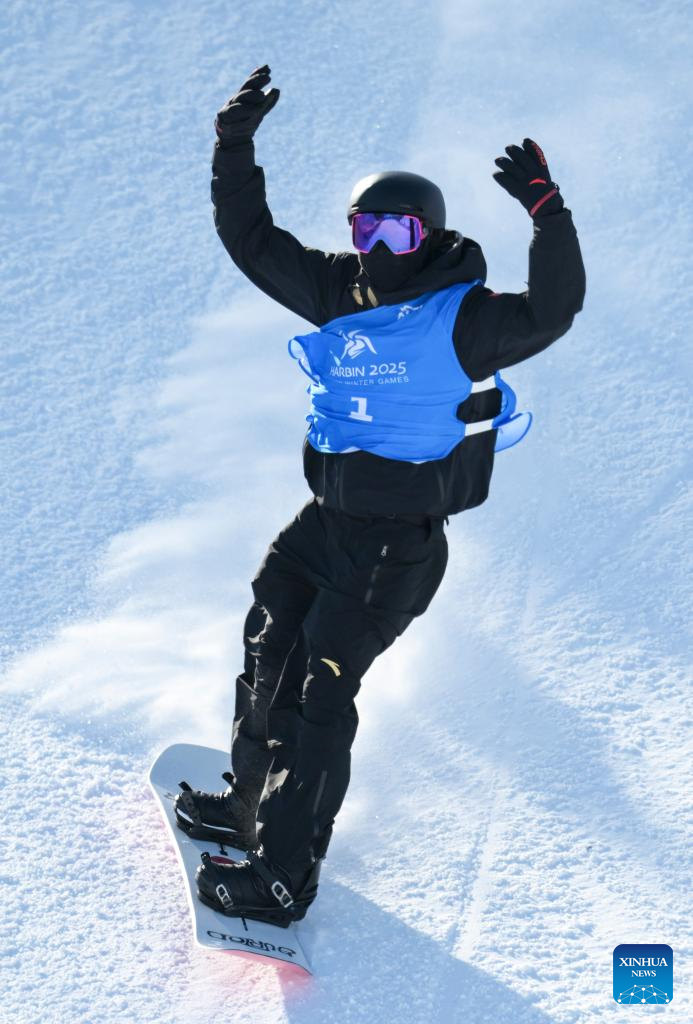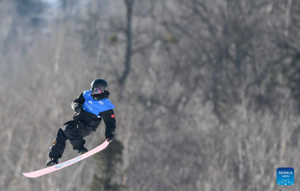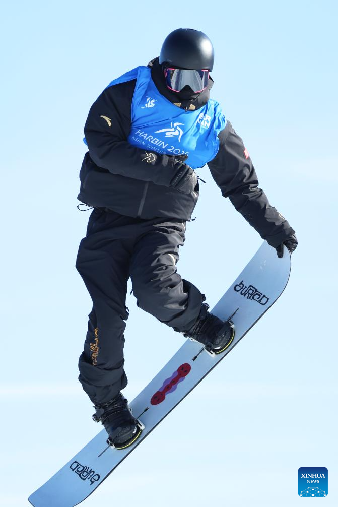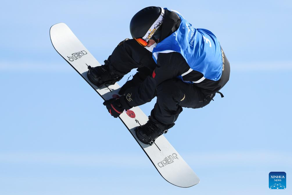 Jiang Xinjie of China competes during the men's snowboard big air final match at the 9th Asian Winter Games in Yabuli, northeast China's Heilongjiang Province, Feb. 10, 2025. (Xinhua/Mu Yu)