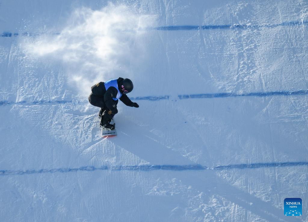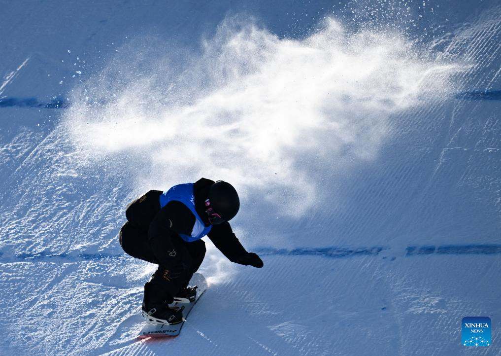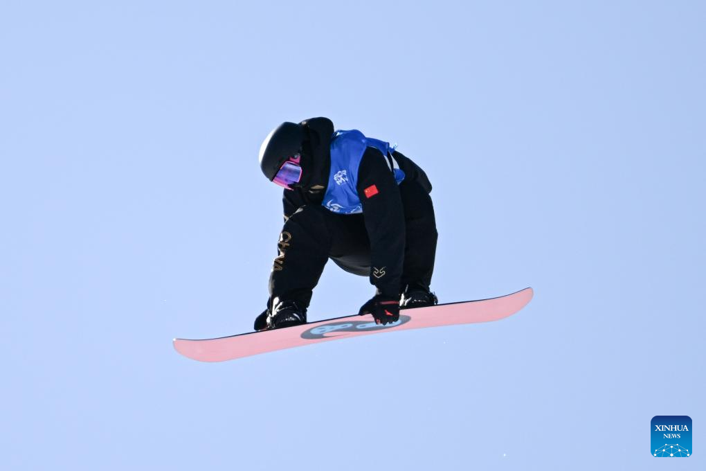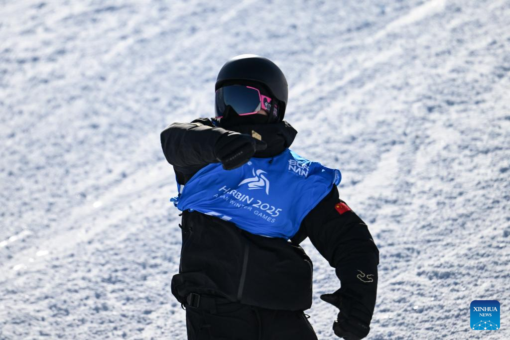 Jiang Xinjie of China competes during the men's snowboard big air final match at the 9th Asian Winter Games in Yabuli, northeast China's Heilongjiang Province, Feb. 10, 2025. (Xinhua/Mu Yu)