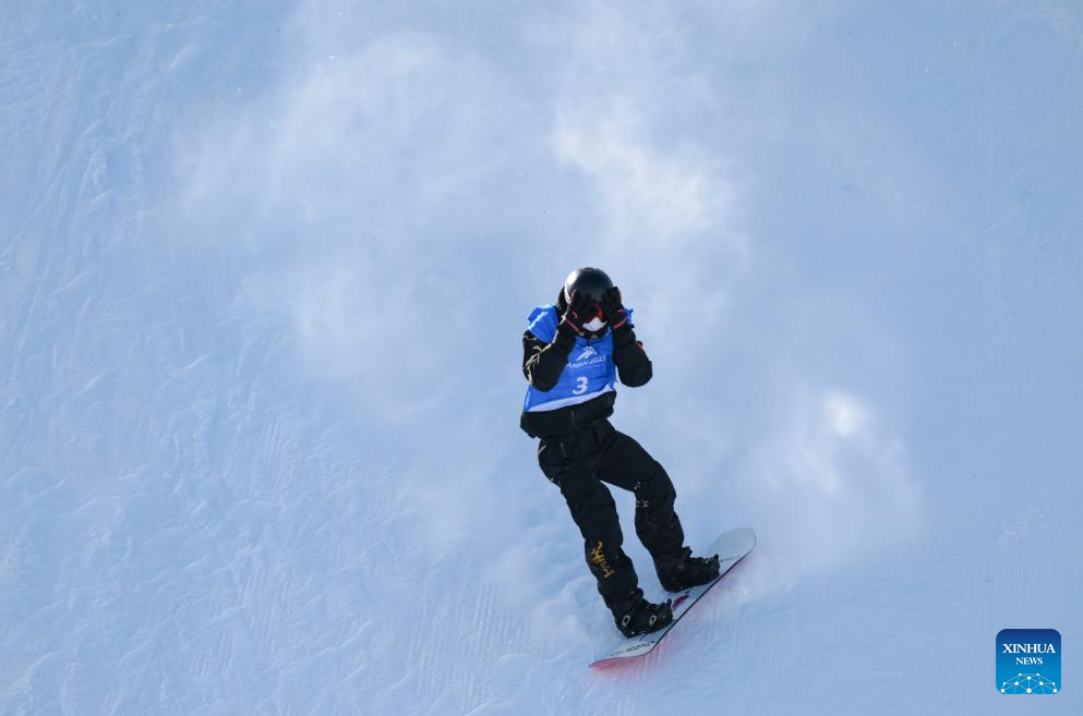 Yang Wenlong of China reacts during the men's snowboard big air final match at the 9th Asian Winter Games in Yabuli, northeast China's Heilongjiang Province, Feb. 10, 2025. (Xinhua/Mu Yu)