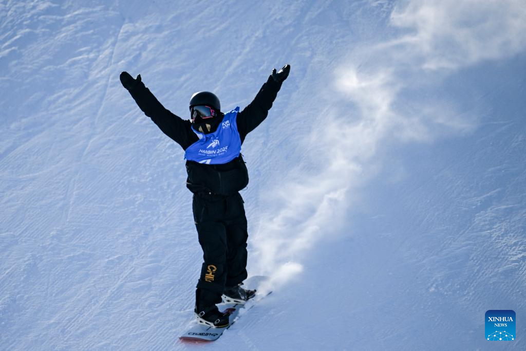 Jiang Xinjie of China celebrates during the men's snowboard big air final match at the 9th Asian Winter Games in Yabuli, northeast China's Heilongjiang Province, Feb. 10, 2025. (Xinhua/Yang Guanyu)