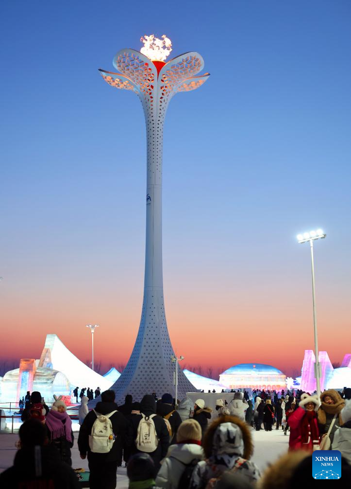 Tourists have fun around the cauldron for the 9th Asian Winter Games at the Harbin Ice and Snow World Park in Harbin, northeast China's Heilongjiang Province, Feb. 9, 2025. With the 9th Asian Winter Games underway, Harbin is attracting numerous domestic and international visitors to enjoy the beauty of winter scenery. (Xinhua/Hou Jun)