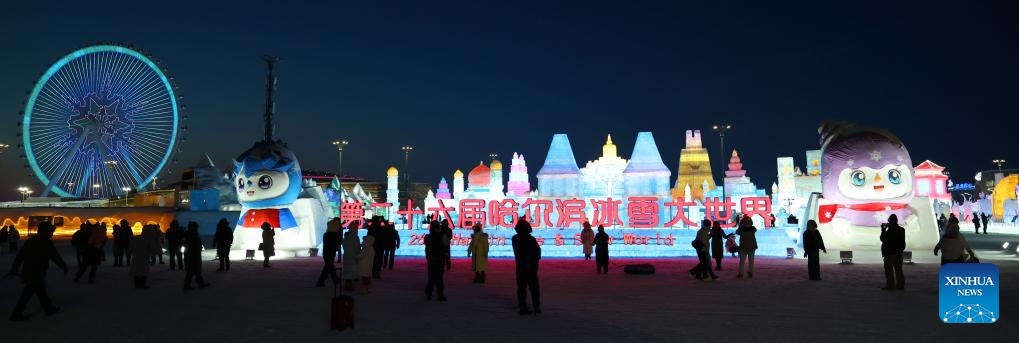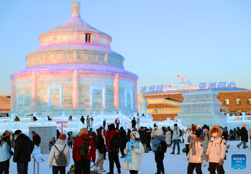 Tourists have fun at the Harbin Ice and Snow World Park in Harbin, northeast China's Heilongjiang Province, Feb. 9, 2025. With the 9th Asian Winter Games underway, Harbin is attracting numerous domestic and international visitors to enjoy the beauty of winter scenery. (Xinhua/Hou Jun)