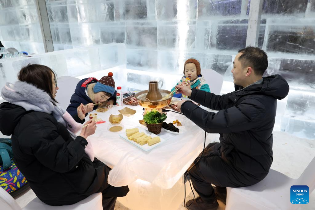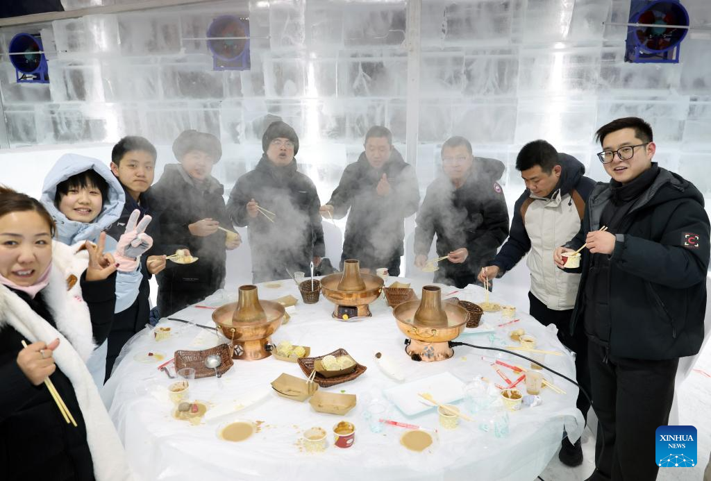 Tourists enjoy hot pot on an ice table at the Harbin Ice and Snow World Park in Harbin, northeast China's Heilongjiang Province, Feb. 9, 2025. With the 9th Asian Winter Games underway, Harbin is attracting numerous domestic and international visitors to enjoy the beauty of winter scenery. (Xinhua/Hou Jun)