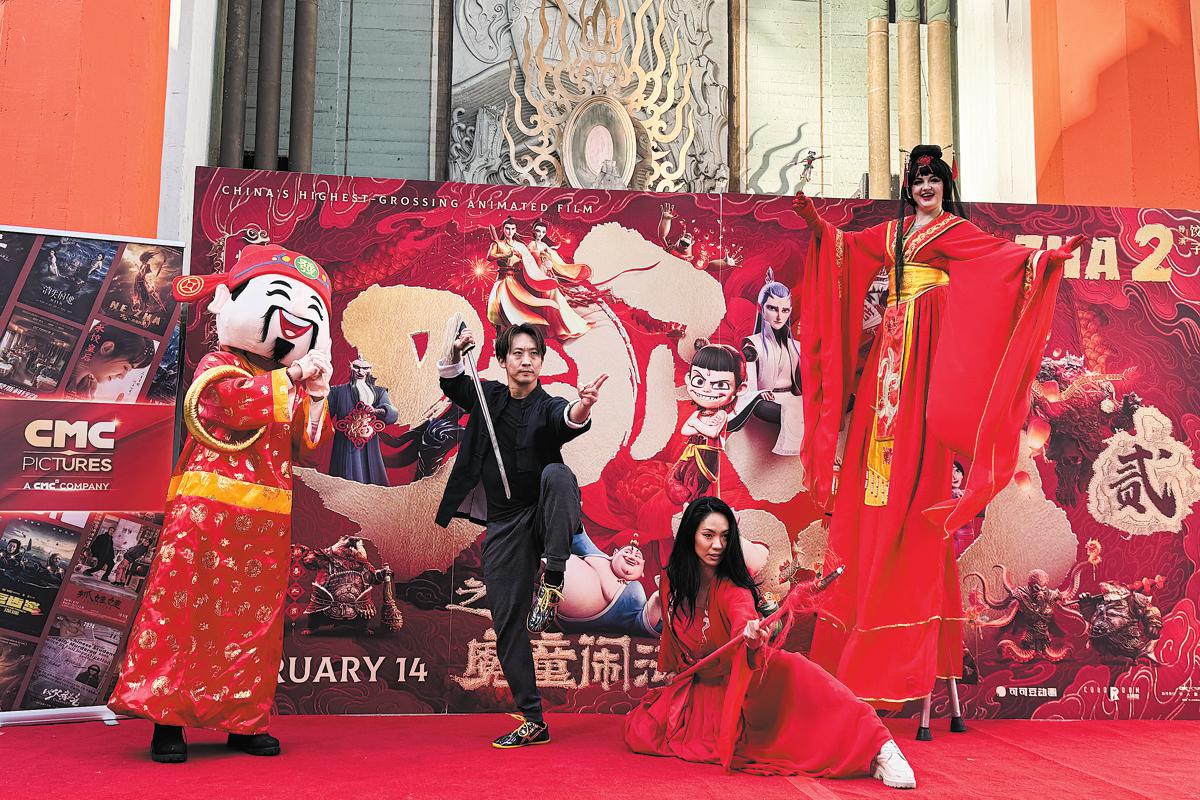 Performers entertain at the premiere of hit Chinese film Ne Zha 2 at the TCL Chinese Theatre in Hollywood, Los Angeles, in the US state of California, on Saturday. (Rena Li/China Daily)