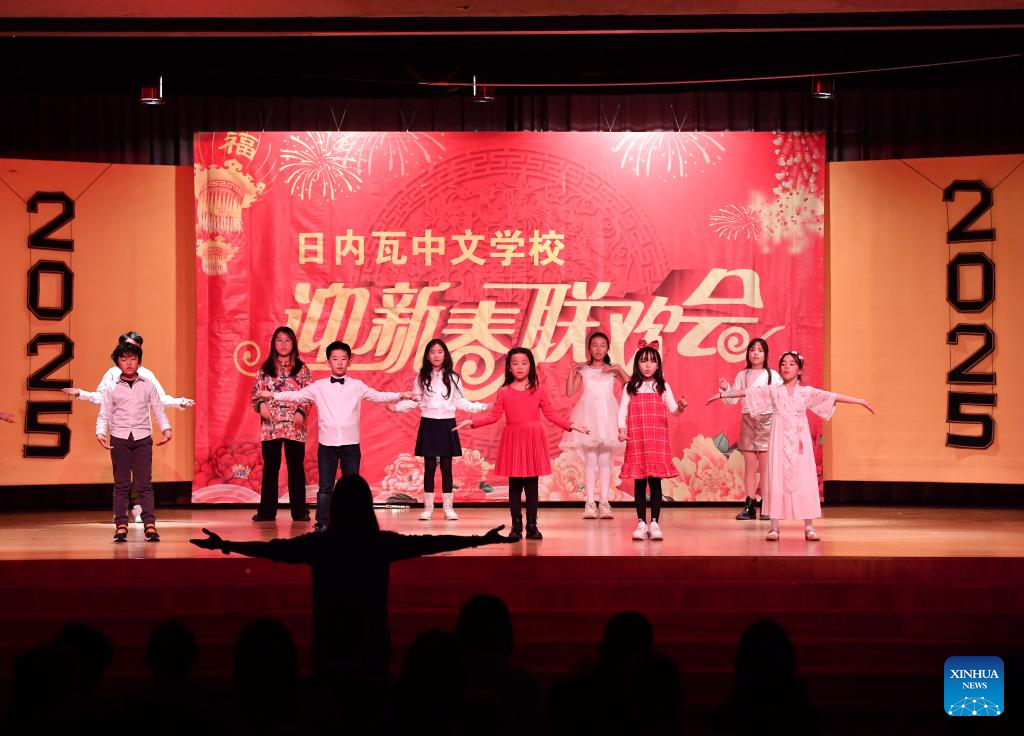 Students perform during a Spring Festival Gala to celebrate the Chinese New Year at Geneva Chinese School in Geneva, Switzerland, Feb. 9, 2025. Geneva Chinese School held a Spring Festival Gala on Sunday to celebrate the Chinese New Year, with over 20 performances staged by students and their teachers and parents. The event aimed to celebrate the Spring Festival, promote Chinese culture, and showcase the students' achievements in learning the Chinese language. (Xinhua/Lian Yi)