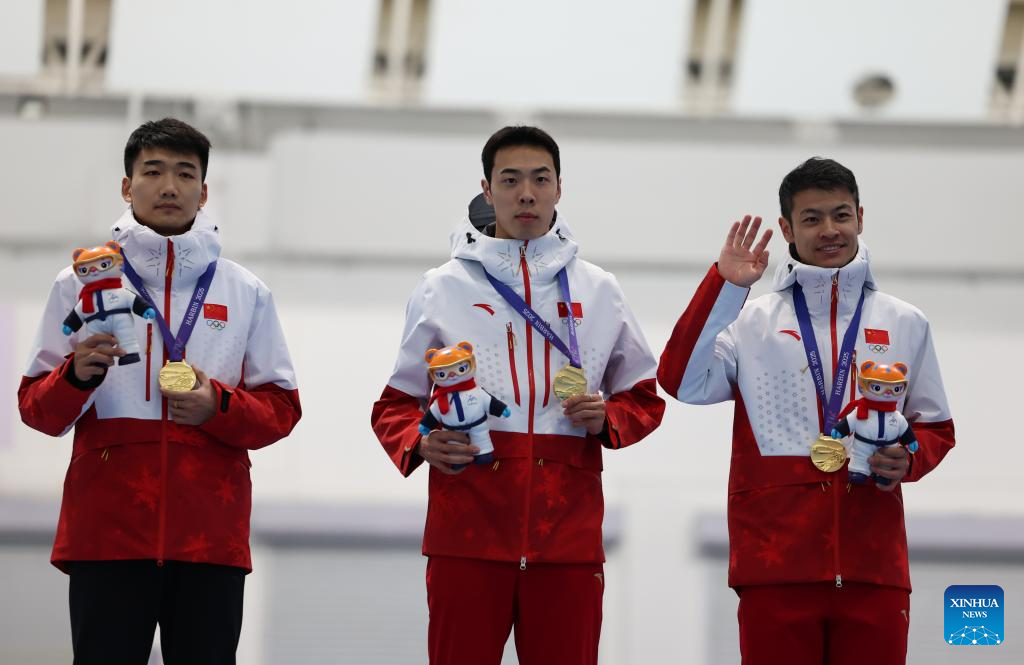 Gao Tingyu (L), Lian Ziwen (C) and Ning Zhongyan of China pose during the awarding ceremony after the men's team sprint final match of the speed skating event at the 9th Asian Winter Games in Harbin, northeast China's Heilongjiang Province, Feb. 10, 2025. (Xinhua/Wang Kaiyan)