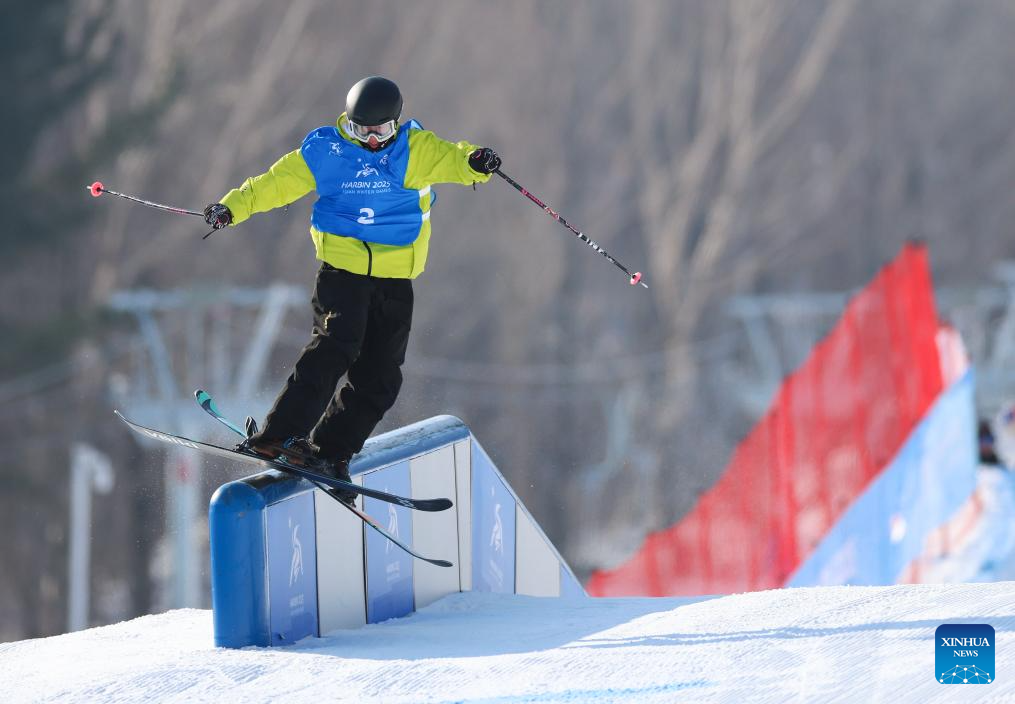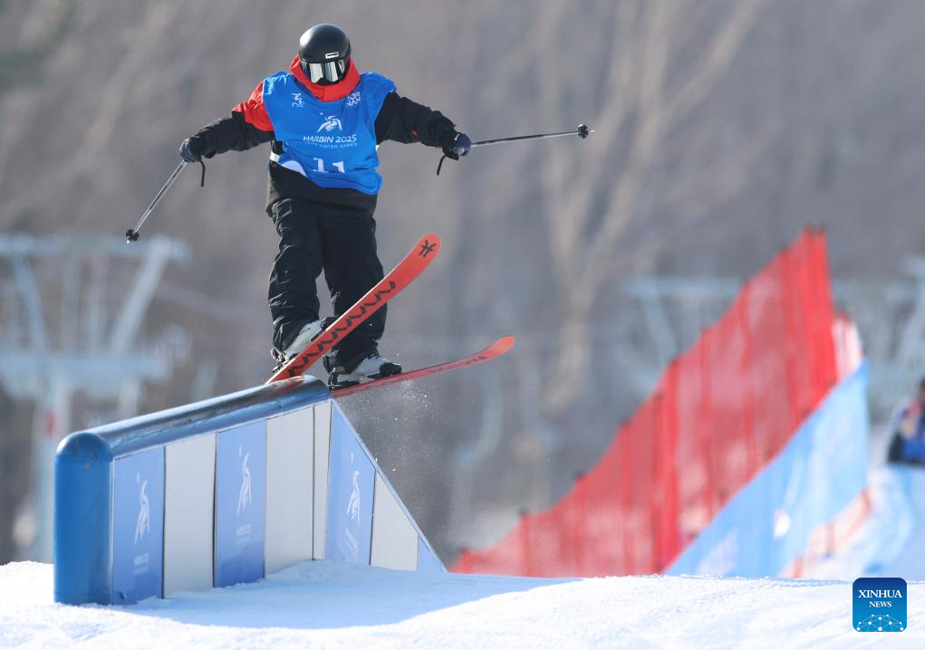 Abdulla Alrasheed of the United Arab Emirates (UAE) competes during the Freestyle Skiing men's freeski slopestyle final at the 9th Asian Winter Games in Yabuli, northeast China's Heilongjiang Province, Feb. 11, 2025. (Xinhua/Yang Qing)