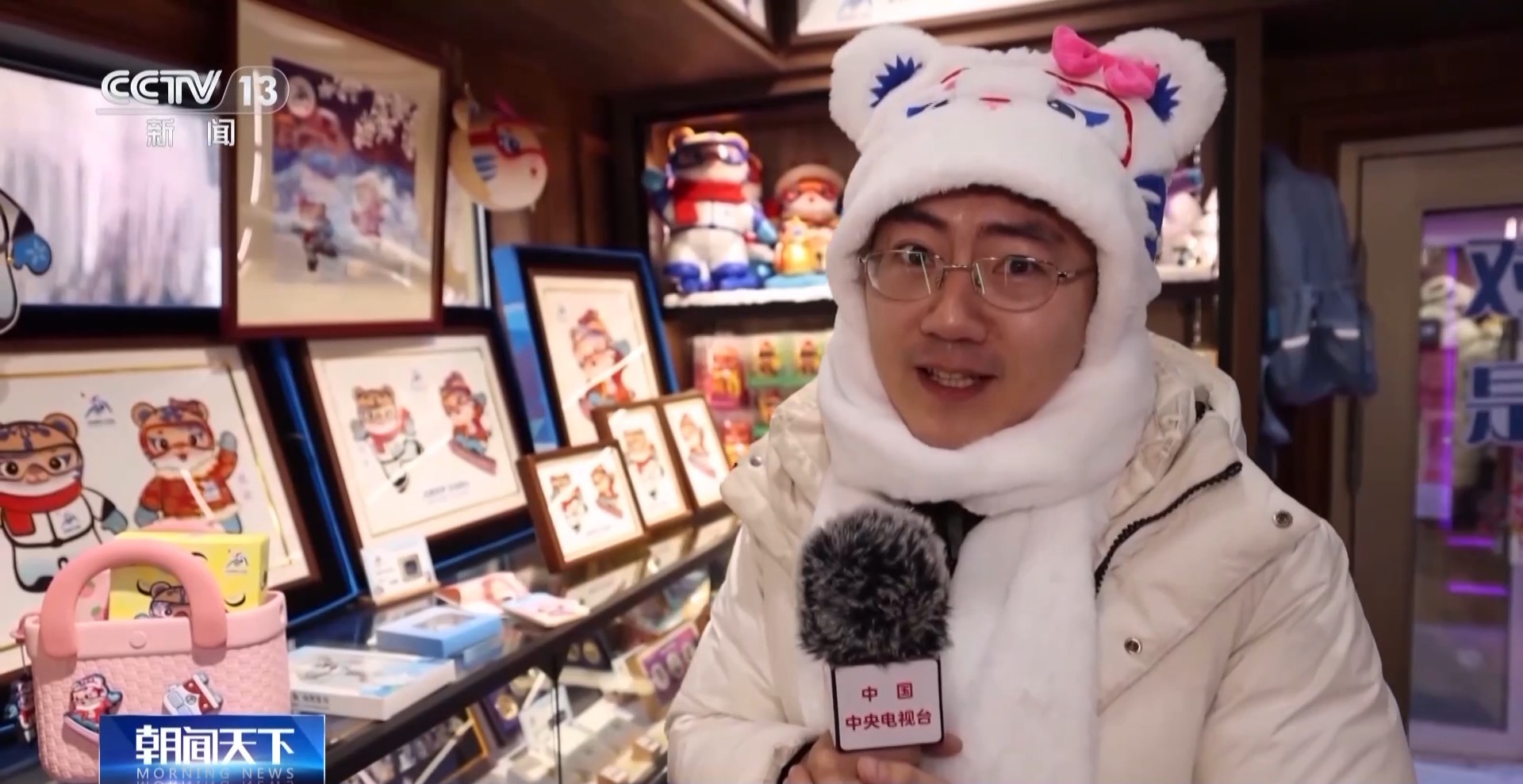 A journalist from CCTV wears a hat featuring "Nini," the official mascot for the 9th Asian Winter Games. (Photo/CCTV)