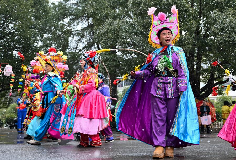 WUHAN, Feb. 11 (Xinhua) -- Lichuan Dengge, originated from Lichuan City of Hubei Province, is a vibrant traditional folk art performed during festivals with colorful props like dragon boats and lantern carts. It features lively songs and interactive performances, reflecting the rich cultural heritage of the Tujia ethnic group. In 2011, Lichuan Dengge was listed among the third batch of national intangible cultural heritage.
