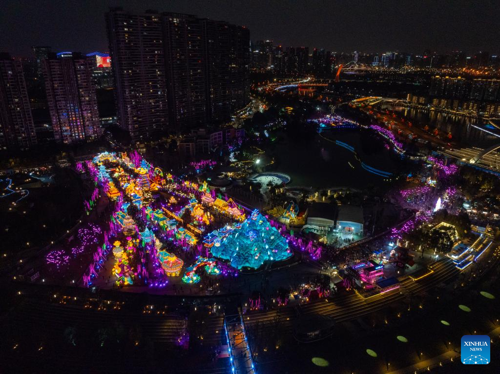 An aerial drone photo taken on Feb. 12, 2025 shows a view of the 54th Chengdu international panda lantern fair in Chengdu, southwest China's Sichuan Province. Various activities were held across China to celebrate the Lantern Festival, which falls on the fifteenth day of the first month of the Chinese lunar calendar. (Xinhua/Shen Bohan)