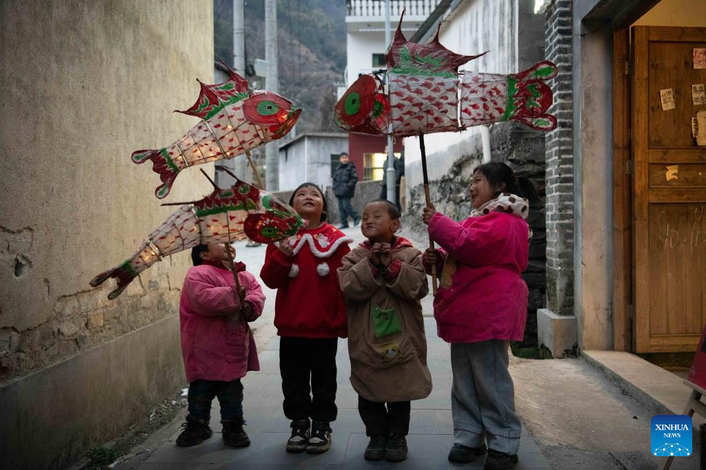 Kids holding fish-shaped lanterns pose for photos in Wangmantian Village of Xitou Town in Shexian County, Huangshan City of east China's Anhui Province, Feb. 10, 2025. Local villagers have the tradition to make fish-shaped lanterns to pray for harvest and good fortune and parade with them cheerfully around the Lantern Festival, which falls on the 15th day of the first month of the Chinese lunar calendar, or Feb. 12 this year. (Xinhua/Zhang Duan)