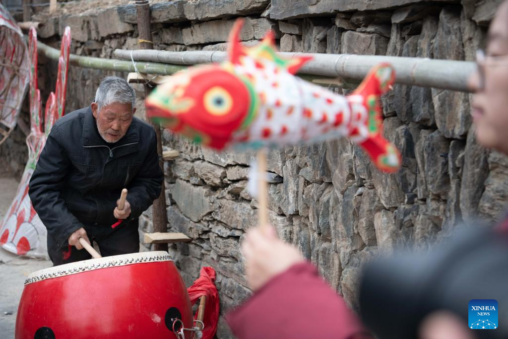 A villager practices drumming in Wangmantian Village of Xitou Town in Shexian County, Huangshan City of east China's Anhui Province, Feb. 10, 2025. Local villagers have the tradition to make fish-shaped lanterns to pray for harvest and good fortune and parade with them cheerfully around the Lantern Festival, which falls on the 15th day of the first month of the Chinese lunar calendar, or Feb. 12 this year. (Xinhua/Zhang Duan)