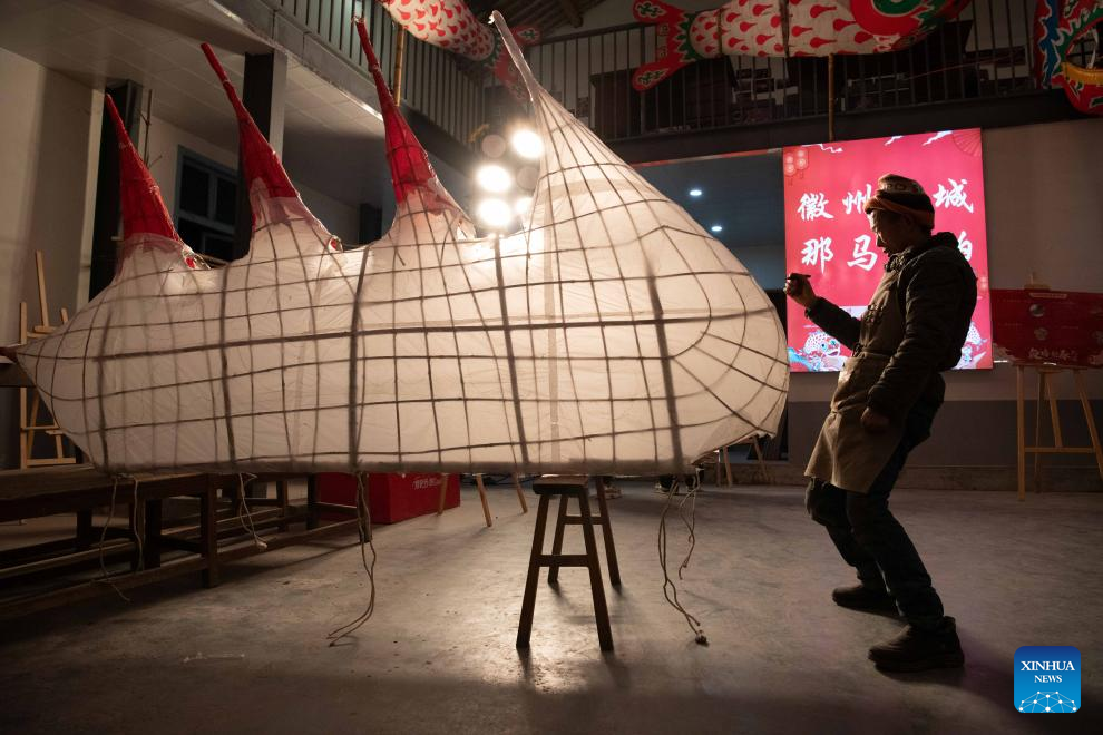A villager makes fish-shaped lanterns in Wangmantian Village of Xitou Town in Shexian County, Huangshan City of east China's Anhui Province, Feb. 10, 2025. Local villagers have the tradition to make fish-shaped lanterns to pray for harvest and good fortune and parade with them cheerfully around the Lantern Festival, which falls on the 15th day of the first month of the Chinese lunar calendar, or Feb. 12 this year. (Xinhua/Zhang Duan)