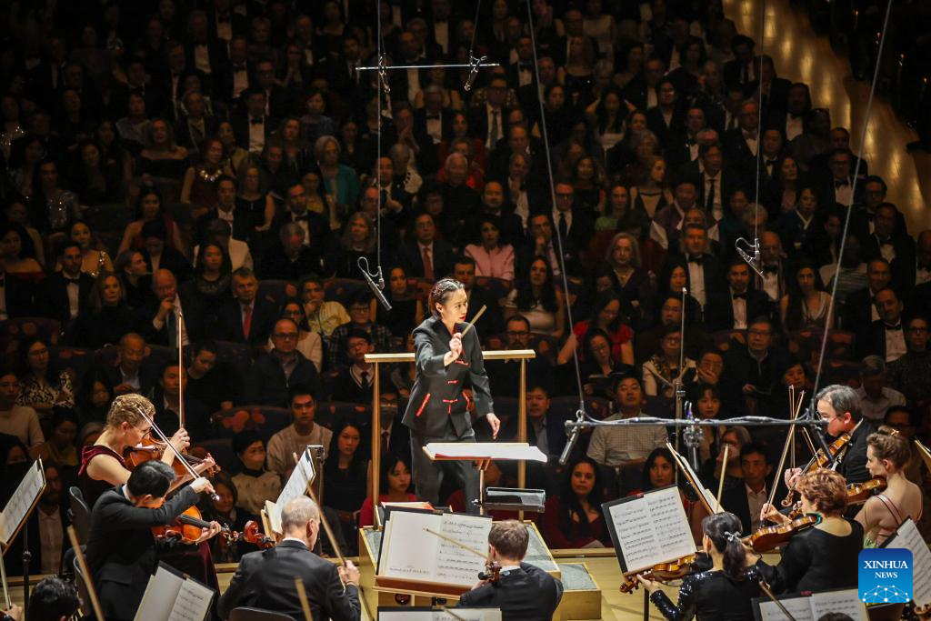 Tianyi Lu conducts in a concert celebrating the Spring Festival by the New York Philharmonic in New York City, the United States, Feb. 11, 2025. (Photo by Winston Zhou/Xinhua)