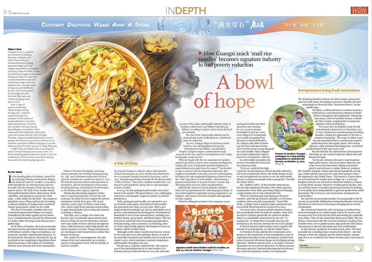A bowl of Liuzhou snail noodles weaves together the threads of rural prosperity, Lu told the Global Times.