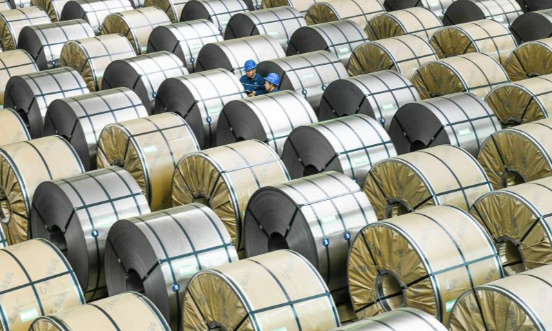 Employees check steel rolls at a steel plant in Tangshan, Hebei province. (Liu Mancang/Xinhua)