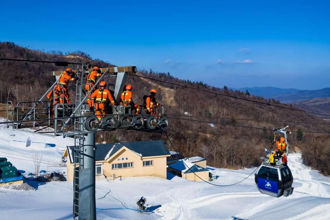 At the Yabuli Ski Resort, the venue for snow events of the 9th Asian Winter Games, firefighters conduct specialized training and technical drills for snowfield rescue in preparation for the Games, Nov. 21, 2024. (People's Daily Online/Wang Hongtong)