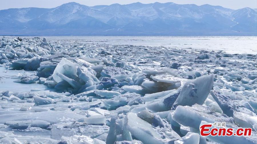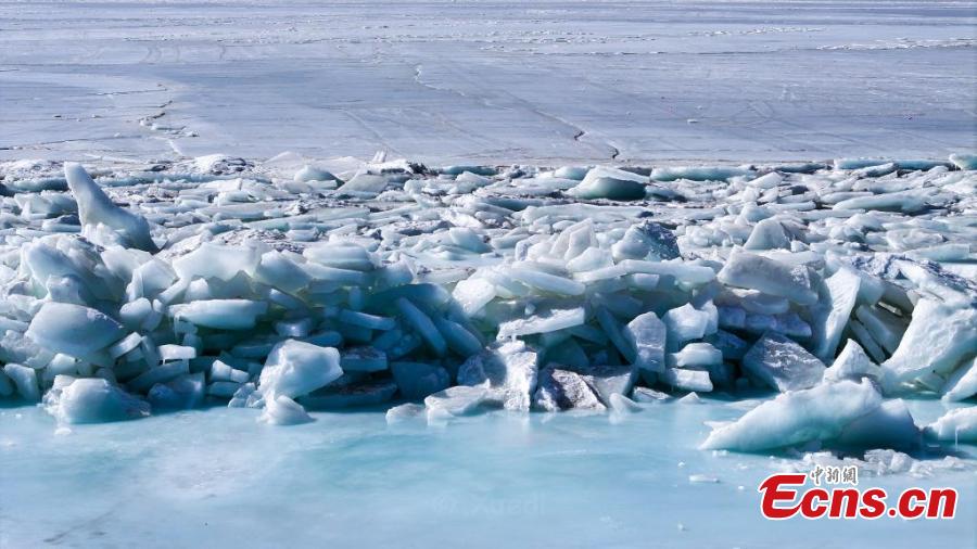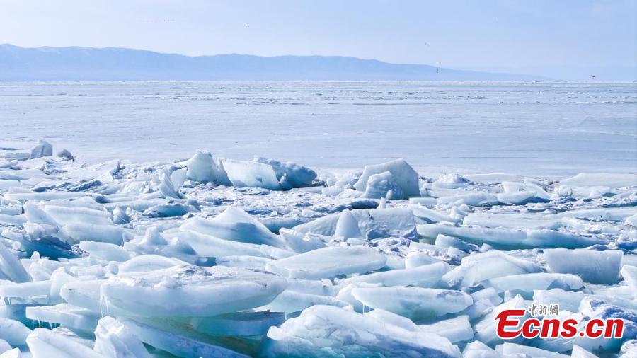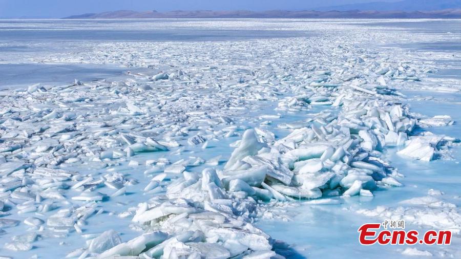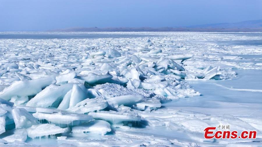 Chunks of blue ice pile up on Qinghai Lake, China's largest inland saltwater lake in Hainan Tibetan Autonomous Prefecture, northwest China's Qinghai Province, Feb. 13, 2025. (China News Service/Xue Di)