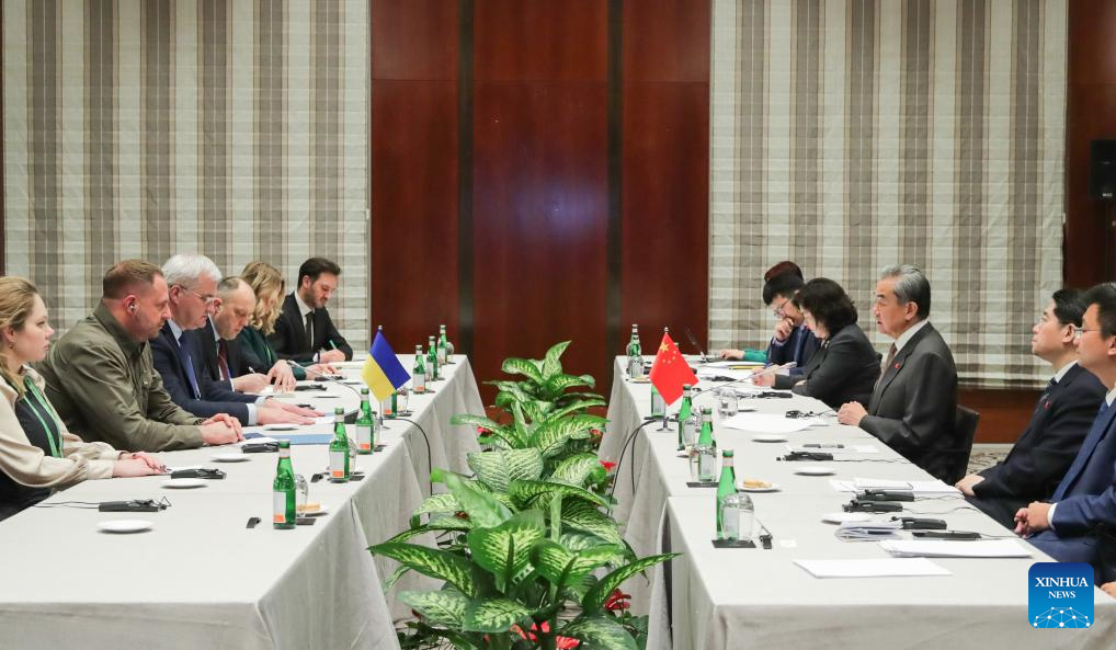 MUNICH, Germany, Feb. 15 (Xinhua) -- Chinese Foreign Minister Wang Yi on Saturday reaffirmed China's commitment to promoting peace while meeting with his Ukrainian counterpart Andrii Sybiha in Munich, Germany.