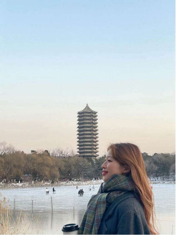 Bae Hye-eun is enjoying a coffee while watching ice skaters glide across the frozen lake on the campus of Peking University. (Photo provided to People's Daily)