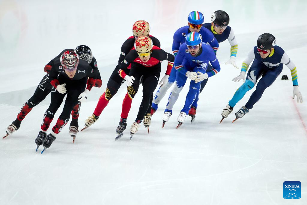 Skaters compete during the men's 5000m relay final A at the ISU Short Track World Tour 2024/2025 in Milan, Italy, Feb. 16, 2025. (Xinhua/Meng Dingbo)