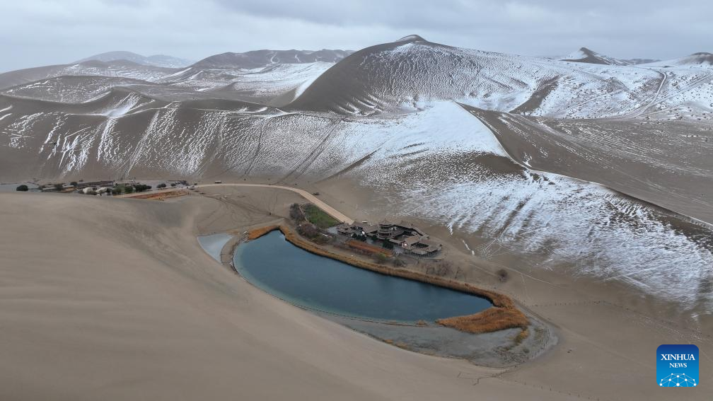 An aerial drone photo shows the mingsha mountain and crescent spring scenic spot in Dunhuang, northwest China's Gansu Province, Nov. 23, 2024. Around 2,000 years ago, Dunhuang was a key hub on the ancient Silk Road. Chinese silk and tea passed through this gateway en route to other countries, while agricultural products such as grapes, carrots and pomegranates made their way into China.