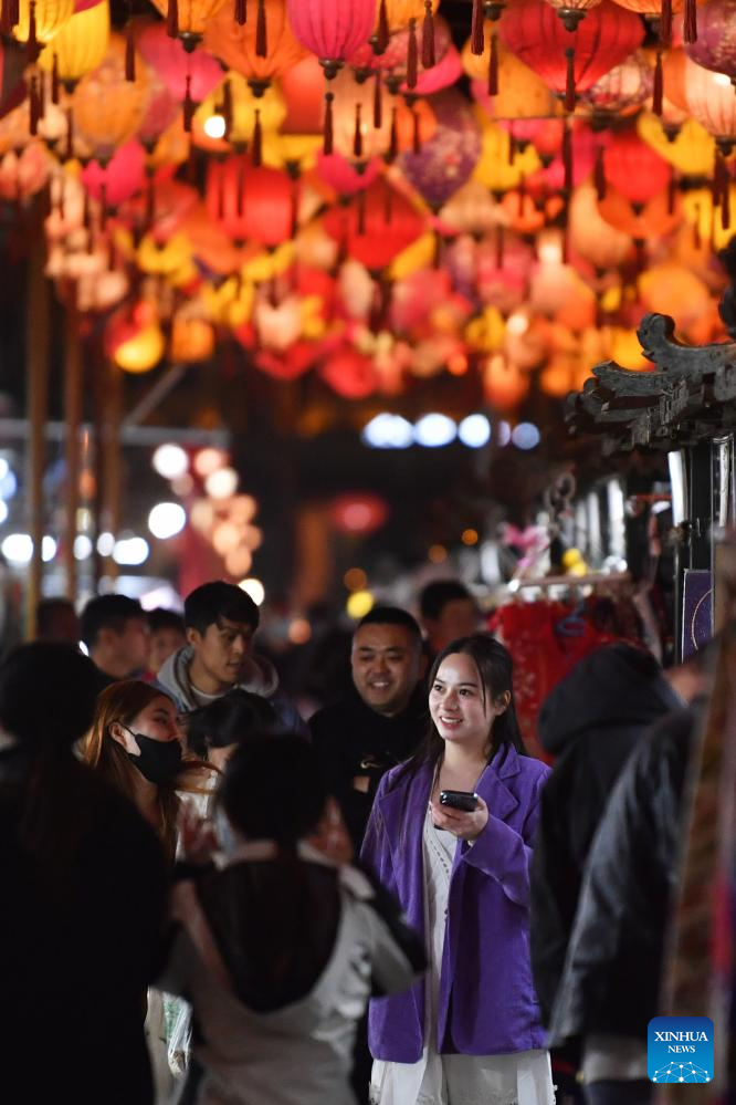 Tourists visit a night market in Dunhuang, northwest China's Gansu Province, March 16, 2023. Around 2,000 years ago, Dunhuang was a key hub on the ancient Silk Road. Chinese silk and tea passed through this gateway en route to other countries, while agricultural products such as grapes, carrots and pomegranates made their way into China.