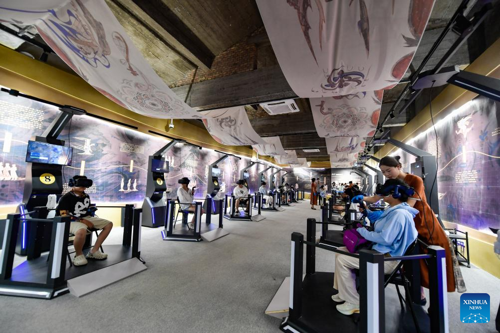 Tourists try out VR devices to experience virtual tours of Dunhuang in Dunhuang, northwest China's Gansu Province, July 22, 2024. Around 2,000 years ago, Dunhuang was a key hub on the ancient Silk Road. Chinese silk and tea passed through this gateway en route to other countries, while agricultural products such as grapes, carrots and pomegranates made their way into China.