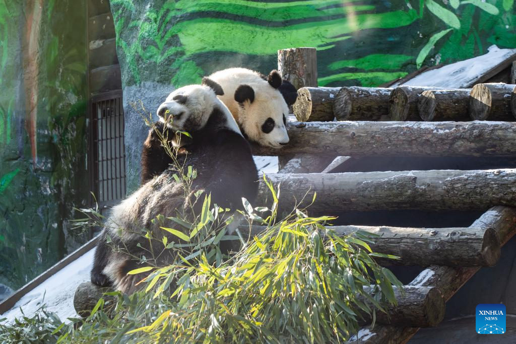 Giant panda Katyusha (R) and its mother Ding Ding enjoy meal at Moscow Zoo in Moscow, Russia, Feb. 18, 2025. Katyusha, Russia's first giant panda cub born at Moscow Zoo, received a chair and a wooden horse as new gifts. Katyusha's father and mother are Ru Yi and Ding Ding, which were sent to Russia in 2019 in commemoration of the 70th anniversary of the establishment of diplomatic relations between China and Russia. (Xinhua/Bai Xueqi)