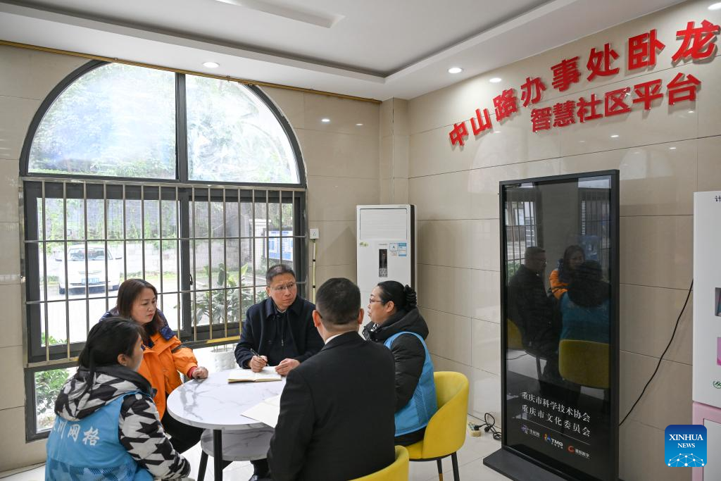 Fu Guotao (C) conducts a survey on grassroots governance at a community in Yongchuan District of Chongqing, southwest China, Feb. 11, 2025. (Xinhua/Wang Quanchao)