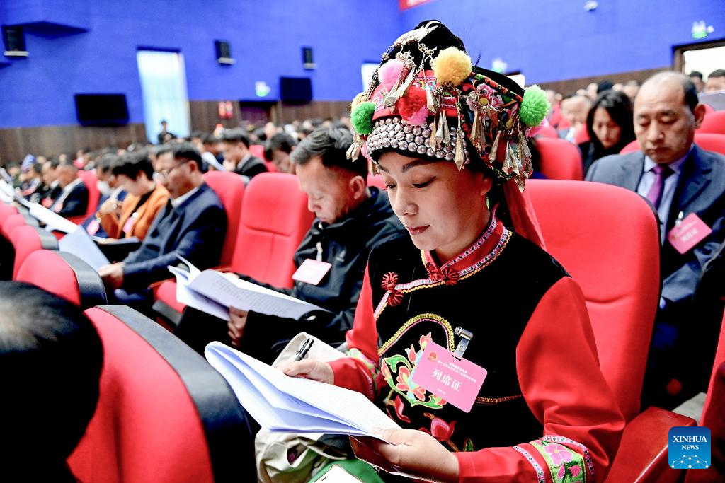 Lu Lihua attends the fourth session of the 13th People's Congress of Nanjian Yi Autonomous County as a nonvoting delegate in the county, southwest China's Yunnan Province, Feb. 11, 2025. (Photo by Shi Zhihong/Xinhua)