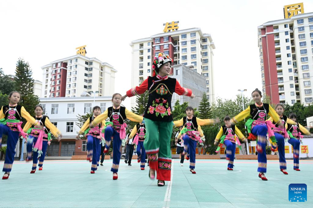 This undated file photo shows Lu Lihua guiding students to dance at a primary school in Nanjian Yi Autonomous County, southwest China's Yunnan Province. (Xinhua)