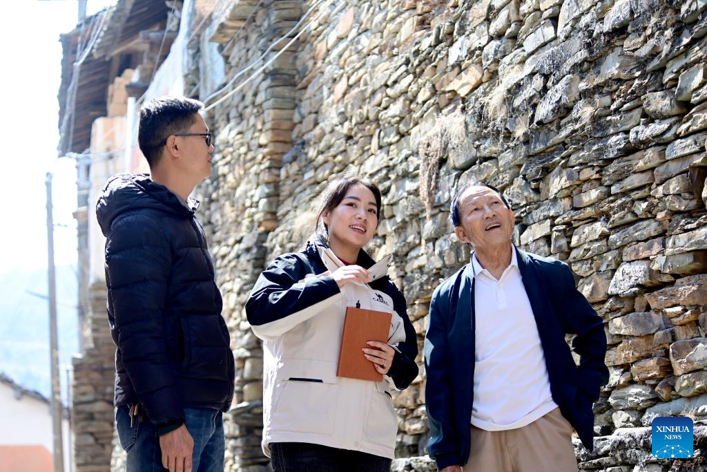 Lu Lihua (C) conducts a survey on a traditional village in Gonglang Town in Nanjian Yi Autonomous County, southwest China's Yunnan Province, Feb. 17, 2025. (Photo by Shi Zhihong/Xinhua)