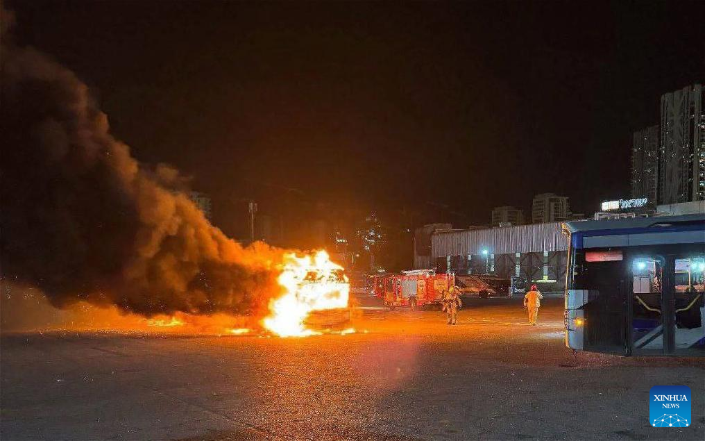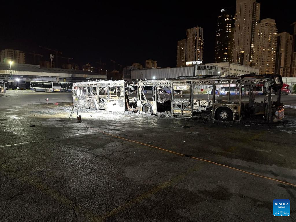 Photo taken on Feb. 20, 2025 shows the scene of a bus explosion in Bat Yam, near Tel Aviv, Israel. Three empty buses exploded simultaneously Thursday night in Israel's Tel Aviv area, while explosive devices were found on at least two others before they could detonate, in what police said was a "suspected terror attack." (Xinhua)