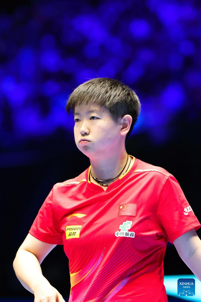 Sun Yingsha of China reacts during the women's singles group 1 match against Sreeja Akula of India at the 34th ITTF-ATTU Asian Cup table tennis tournament in Shenzhen, south China's Guangdong Province, Feb. 20, 2025. (Xinhua/Liang Xu)