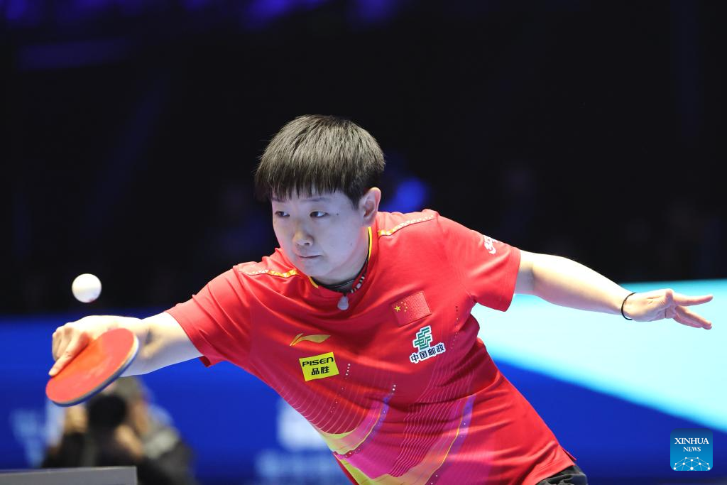 Sun Yingsha of China hits a return during the women's singles group 1 match against Sreeja Akula of India at the 34th ITTF-ATTU Asian Cup table tennis tournament in Shenzhen, south China's Guangdong Province, Feb. 20, 2025. (Xinhua/Liang Xu)