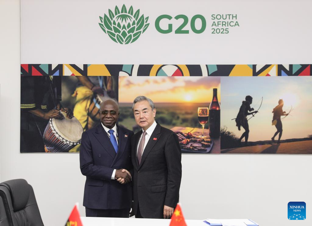 Chinese Foreign Minister Wang Yi, also a member of the Political Bureau of the Communist Party of China Central Committee, meets with his Angolan counterpart Tete Antonio on the sidelines of the Group of 20 (G20) Foreign Ministers' Meeting in Johannesburg, South Africa, Feb. 21, 2025. (Xinhua/Zhang Yudong)