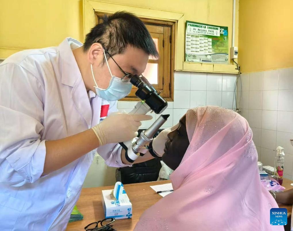 A member of the 20th batch of the Chinese medical team to Senegal checks a patient in Touba, in the central region of Diourbel, Senegal, Feb. 20, 2025. (Xinhua)