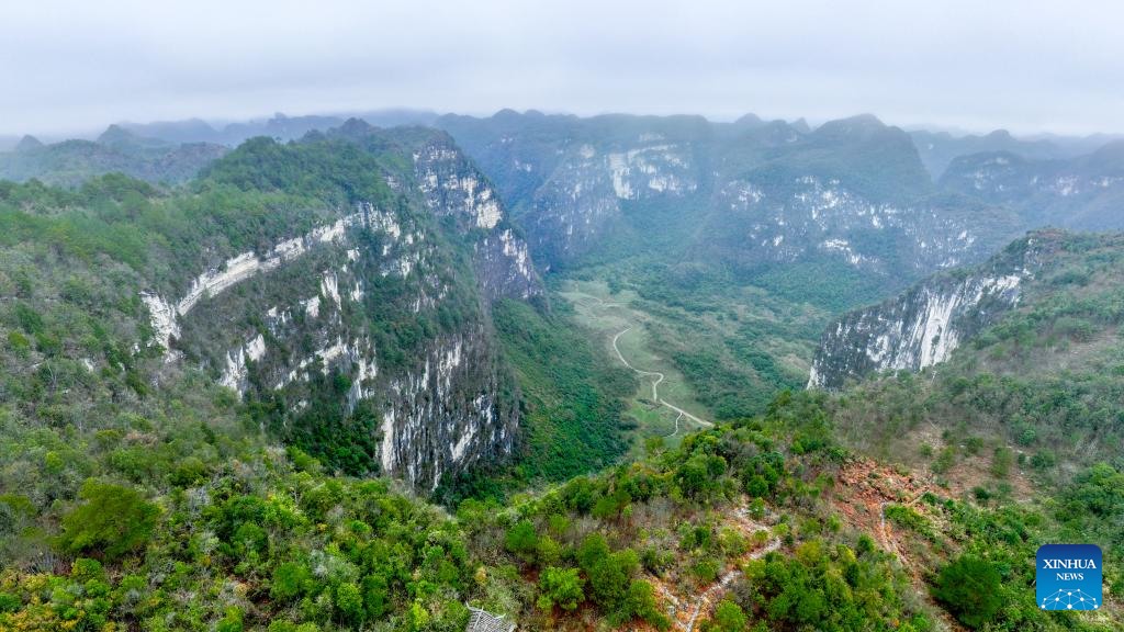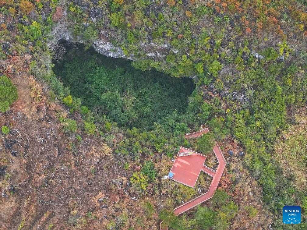 A panoramic drone photo taken on Feb. 19, 2025 shows a natural sinkhole cluster in Pingtang County, southwest China's Guizhou Province. Over hundreds of millions of years, tectonic movements have shaped Guizhou's karst landscape. In Pingtang County, more than 20 giant sinkholes form a spectacular sinkhole cluster.
