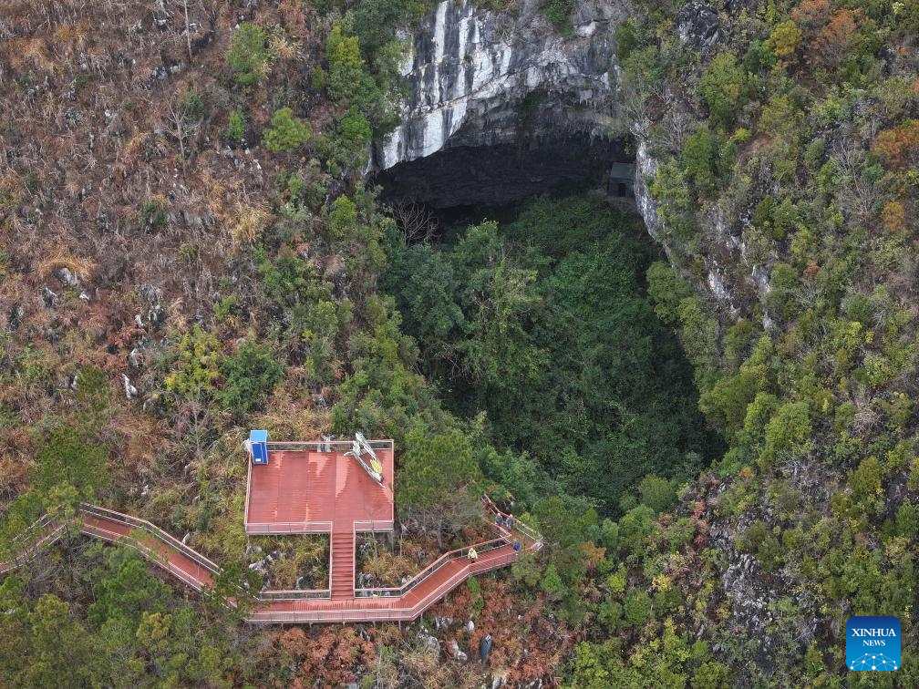 An aerial drone photo taken on Feb. 19, 2025 shows tourists visiting a natural depression in Pingtang County, southwest China's Guizhou Province. Over hundreds of millions of years, tectonic movements have shaped Guizhou's karst landscape. In Pingtang County, more than 20 giant sinkholes form a spectacular sinkhole cluster.