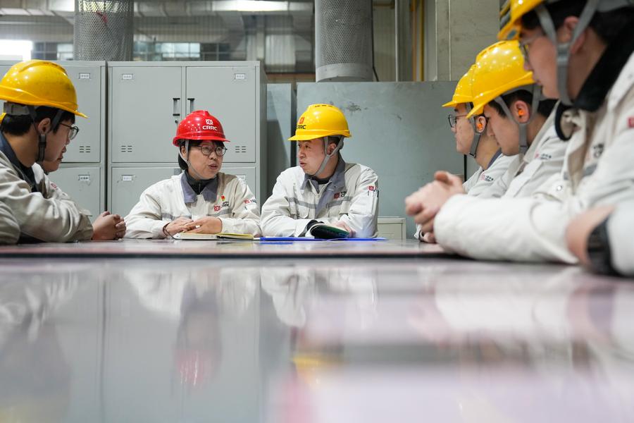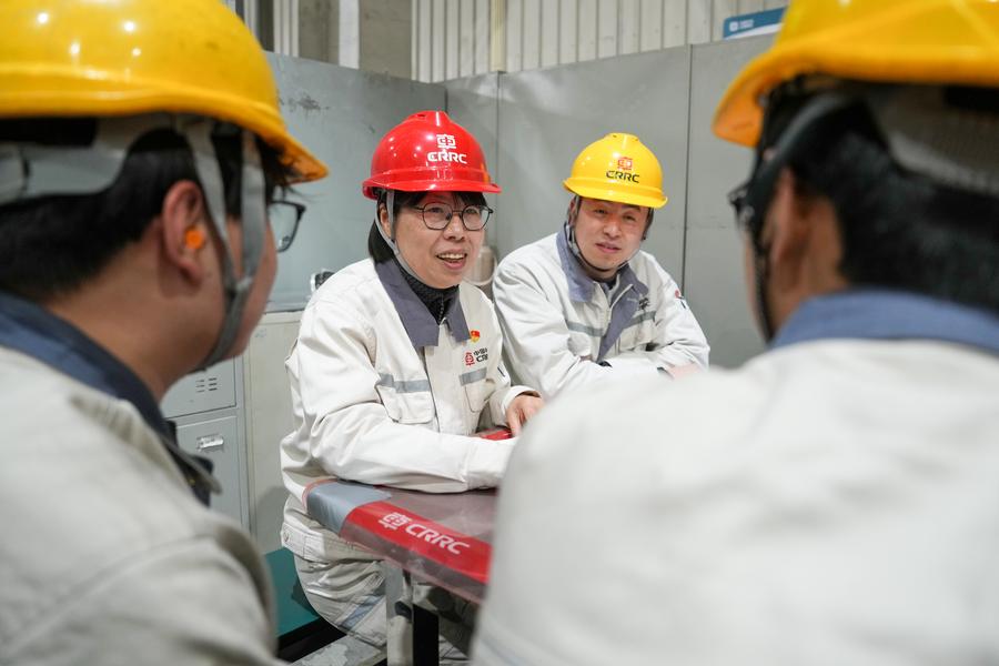 Sun Jingnan (2nd L) talks with colleagues at a workshop of the CRRC Nanjing Puzhen Co., Ltd. in Nanjing, east China's Jiangsu Province, Feb. 20, 2025. (Xinhua/Li Bo)