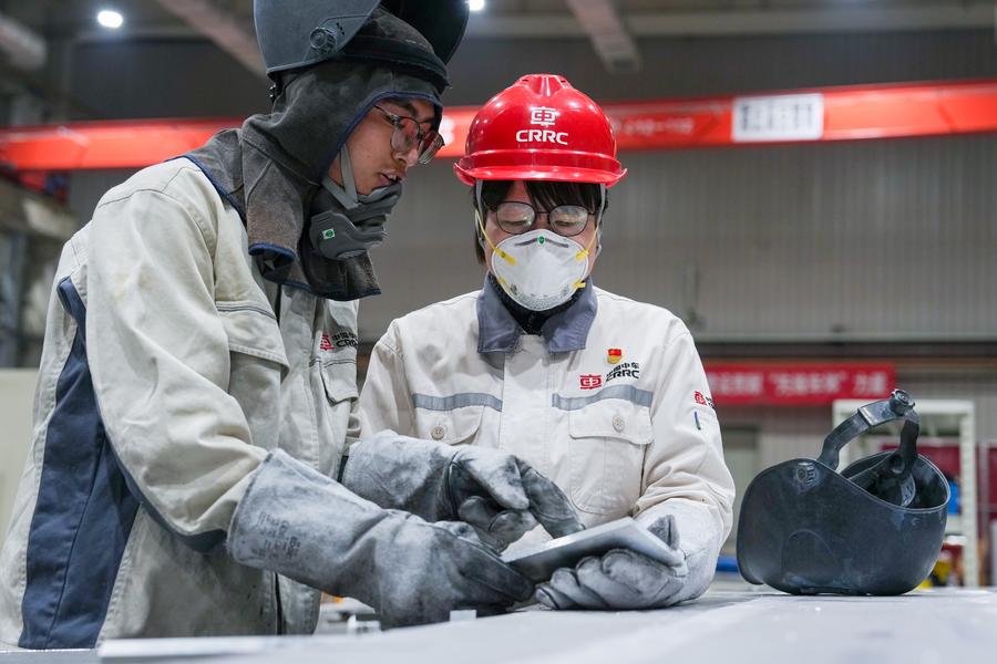 Sun Jingnan (R) instructs a colleague in welding operation at a workshop of the CRRC Nanjing Puzhen Co., Ltd. in Nanjing, east China's Jiangsu Province, Feb. 20, 2025. (Xinhua/Li Bo)