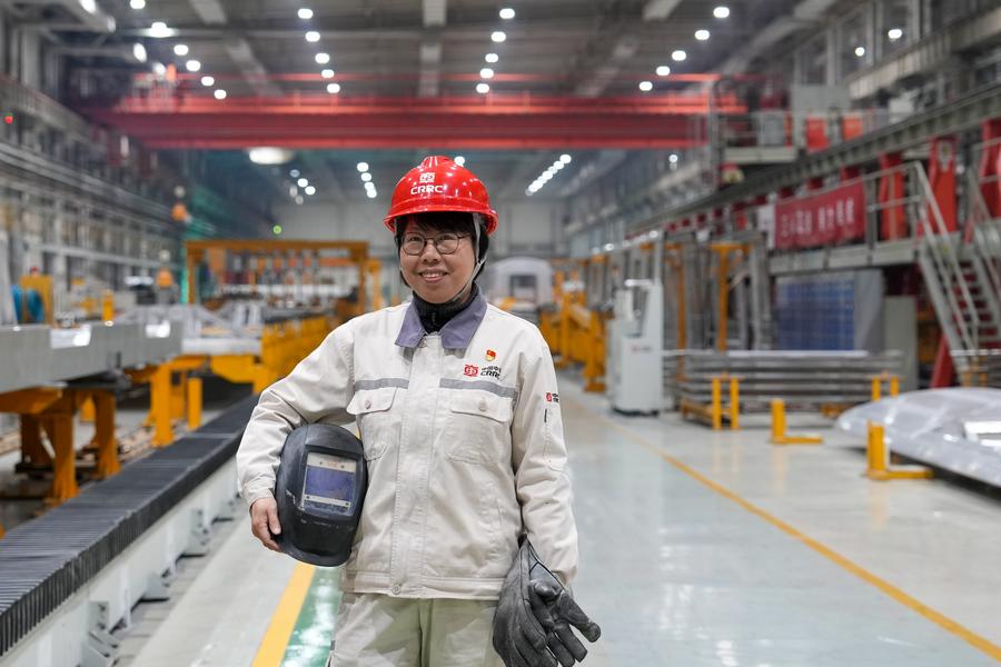 Sun Jingnan poses for a photo at a workshop of the CRRC Nanjing Puzhen Co., Ltd. in Nanjing, east China's Jiangsu Province, Feb. 20, 2025. (Xinhua/Li Bo)