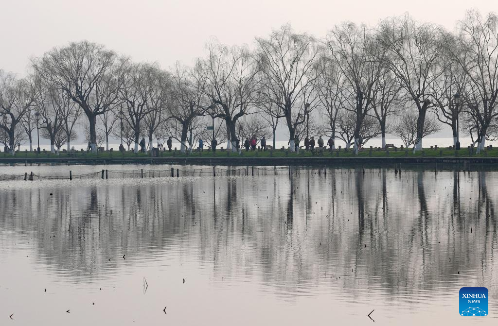 Tourists walk on the Bai Causeway of the West Lake in Hangzhou, east China's Zhejiang Province, Feb. 24, 2025. In early spring, red plum blossoms and the willows in bloom at the West Lake scenic area in Hangzhou attracted numerous tourists. (Xinhua/Han Chuanhao)