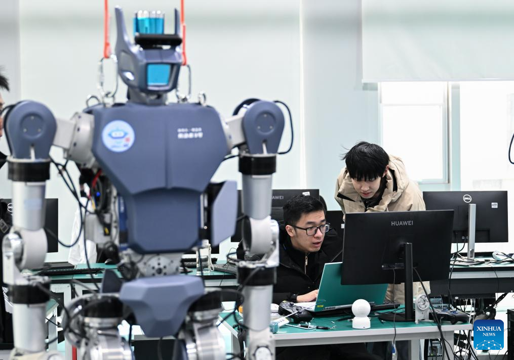Zhu Wenxuan, a member of the R&D team of Wuhan Glory Road Intelligent Technology Co., Ltd., debugs the humanoid robot at the company in Wuhan, central China's Hubei Province, Feb. 24, 2025. Recently, the R&D team of Wuhan Glory Road Intelligent Technology Co., Ltd. has been fine-tuning the strength and dynamic balance of a humanoid robot from the "Laborer" series at the robotics laboratory.